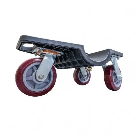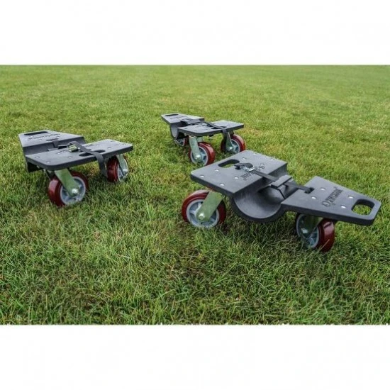 The Kwik Goal soccer goal dollies make transporting any goal with round posts a breeze. The easy strap attachment make it easy to secure the bottom of the frame to the dolly before moving the goal to the desired location. Carrying handles on each dolly assist in moving them in and out of storage. Constructed out of a nylon plastic plate and equipped with polyurethane/steel wheels, these dollies are heavy duty and built to last. See “Additional Info” tab for installation instructions.
